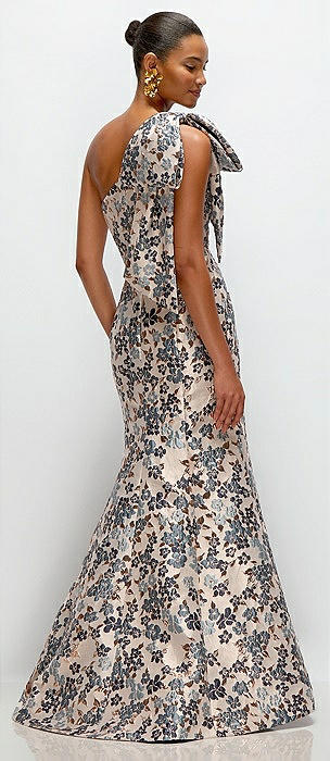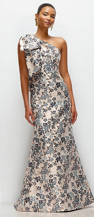 Bow One-Shoulder Gold Leaf Brocade Maxi Dress with Trumpet Skirt in winter mist