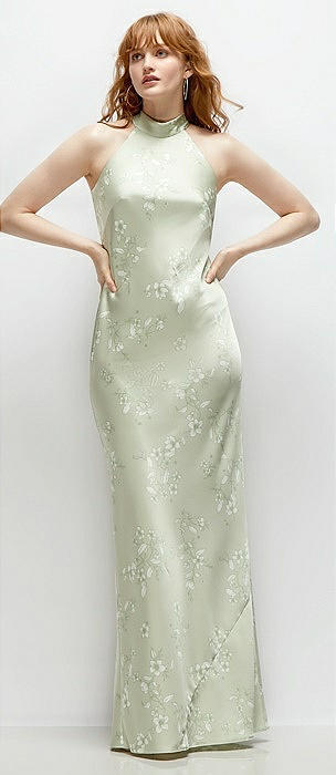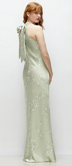 Floral Stand Collar Bias Satin Maxi Dress with Self-Tie Bow Back in vintage primrose celadon