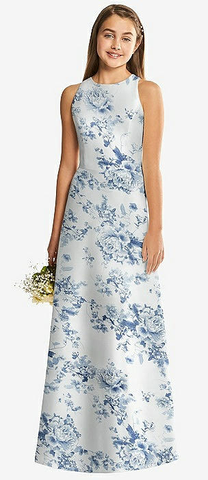Floral Sleeveless Open-Back Satin Junior Bridesmaid Dress in cottage rose larkspur