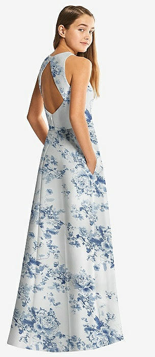 Floral Bateau Neck Maxi Junior Bridesmaid Dress with Pockets in cottage rose larkspur
