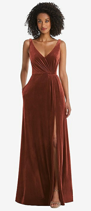 Velvet Maxi Dress with Shirred Bodice and Front Slit in auburn moon