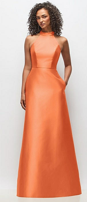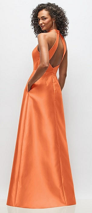Open Neckline Cutout Satin Twill A-Line Gown with Pockets in portofino orange