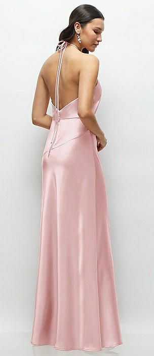 Plunge Halter Open-Back Maxi Bias Dress with Low Tie Back in ballet pink