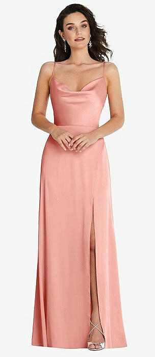 Cowl Neck Criss-Cross Back Satin Maxi Dress in desert rose