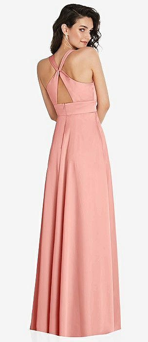 Band Collar Halter Open Back Fluid Satin Maxi Dress with Self-Tie Bow in ballet pink