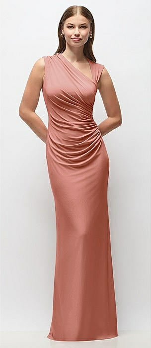 Asymmetrical Cap Sleeve Matte Jersey Column Maxi Dress with Fanned Ruching in desert rose