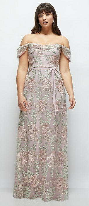Off-the-Shoulder A-line Floral Embroidered Dress with Skinny Tie Sash in suede rose