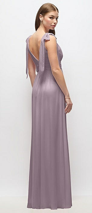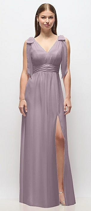 Plunge Neckline Bow Shoulder Empire Waist Chiffon Maxi Dress in lilac dusk