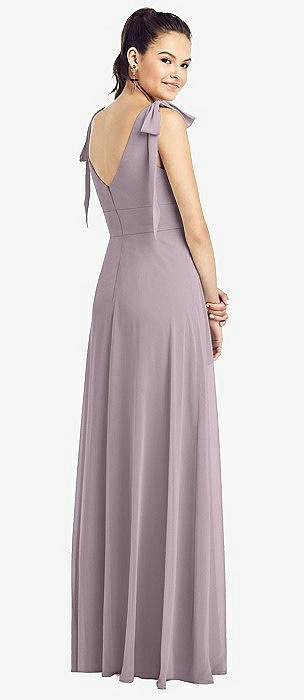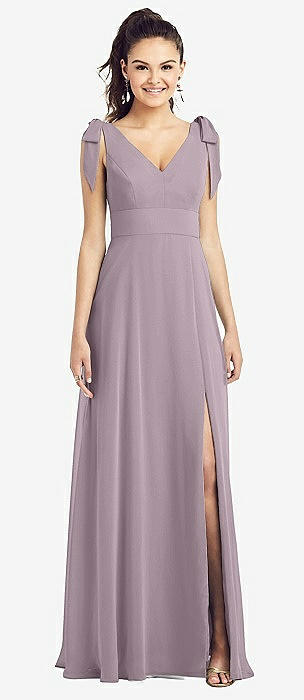 Bow-Shoulder V-Back Chiffon Gown with Front Slit in lilac dusk