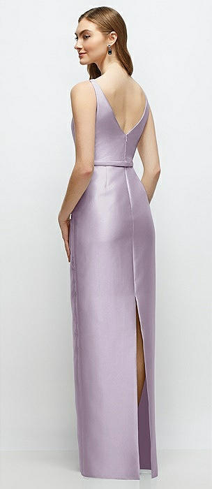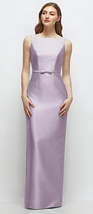 Bateau Neck Satin Column Dress with Bow-Trimmed Skinny Belt in lilac haze