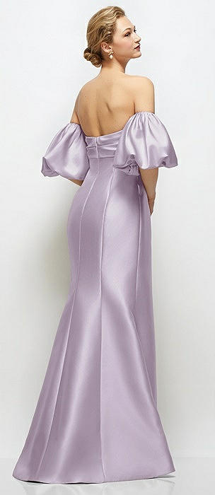 Off-the-Shoulder Puff Sleeve Satin Maxi Dress with Flared Skirt in lilac haze