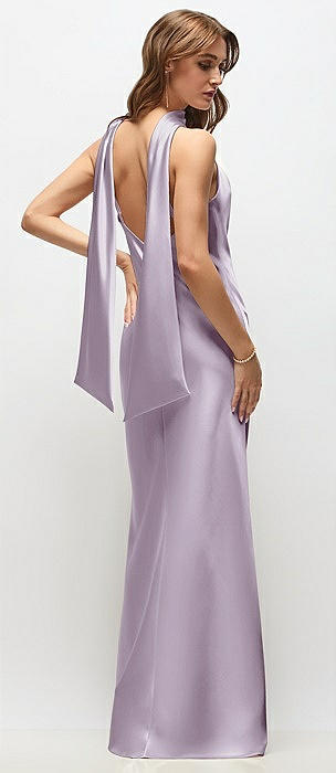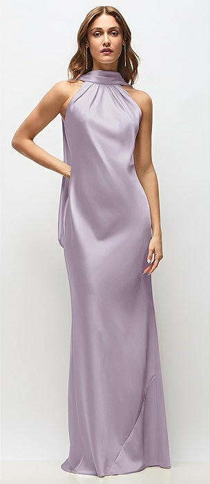 Draped Scarf Halter Open-Back Stretch Satin Bias Maxi Dress with Adjustable Straps in lilac haze