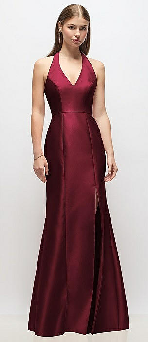 V-Neck Halter Satin Trumpet Gown in cabernet