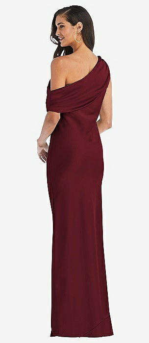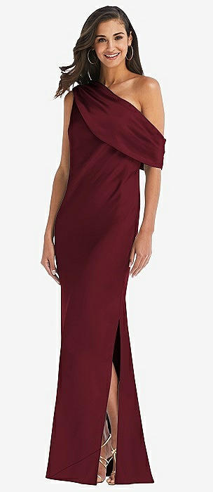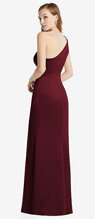 One-Shoulder Crepe Trumpet Gown with Front Slit in cabernet