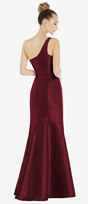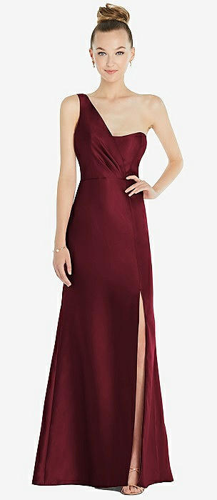 Draped One-Shoulder Satin Trumpet Gown with Front Slit in cabernet