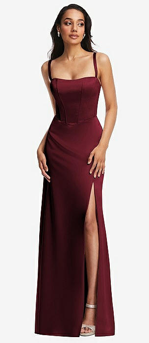 Lace Up Tie-Back Corset Maxi Dress with Front Slit in cabernet