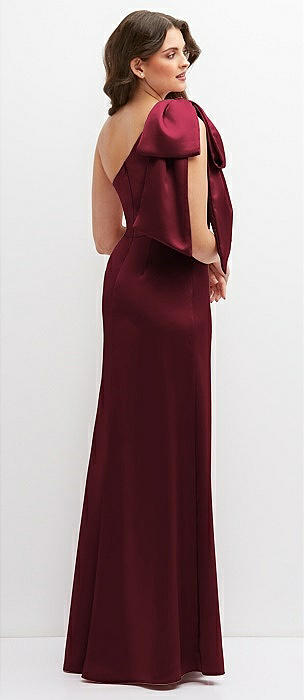 Bow One-Shoulder Satin Maxi Dress with Trumpet Skirt in cabernet