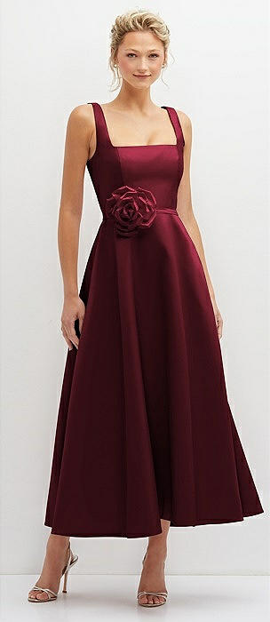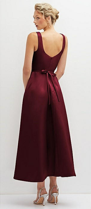 Square Neck Satin Midi Dress with Full Skirt & Flower Sash in cabernet