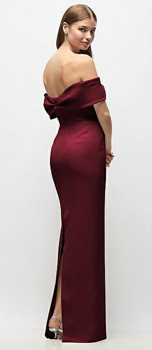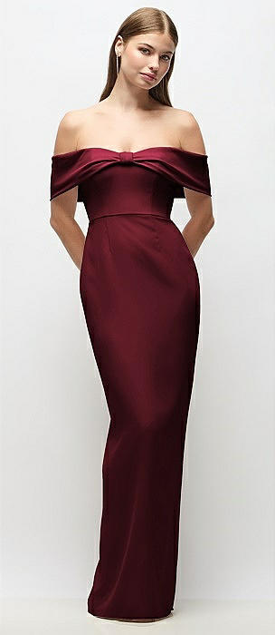 Off-the-Shoulder Crepe Column Maxi Dress with Bow-Pinch Detail in cabernet