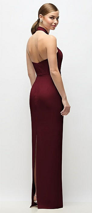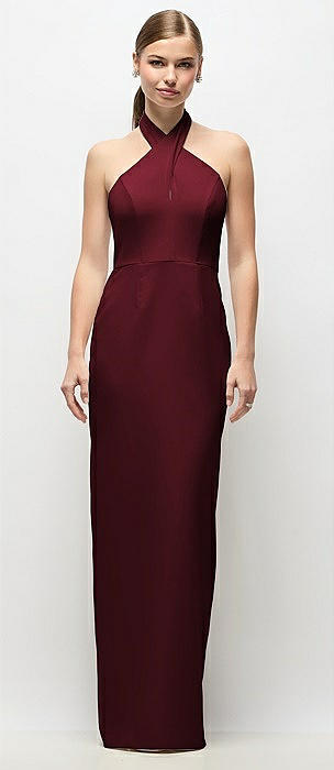 Criss-Cross Halter Open-Back Crepe Column Maxi Dress in cabernet