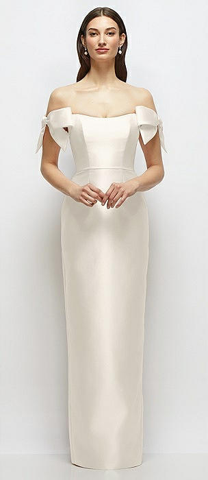 Basque-Neck Satin Column Maxi Dress with Off-the-Shoulder Bows in ivory