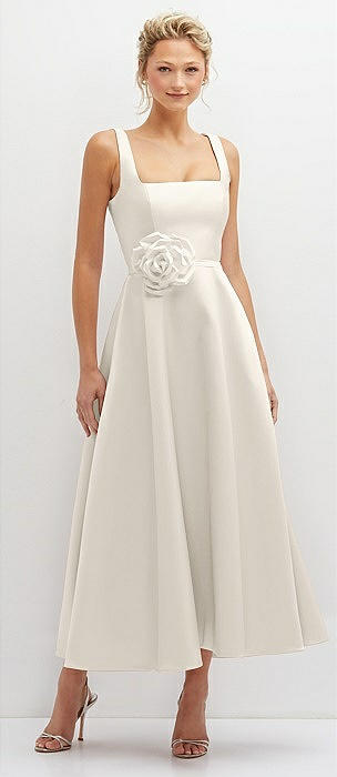 Square Neck Satin Midi Dress with Full Skirt & Flower Sash in ivory
