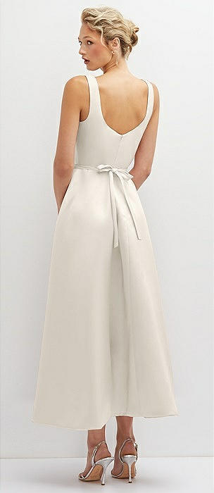 Square Neck Satin Midi Dress with Full Skirt & Pockets in ivory