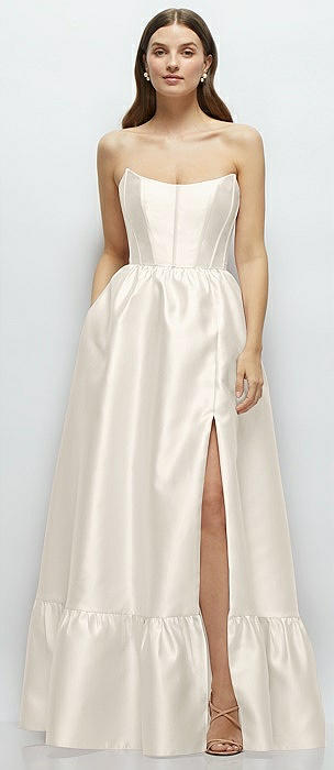 Strapless Cat-Eye Boned Bodice Maxi Dress with Ruffle Hem in ivory
