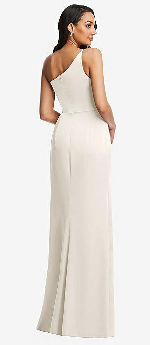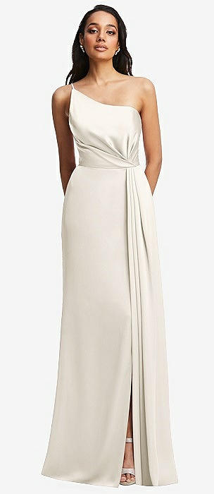 Draped One-Shoulder Satin Trumpet Gown with Front Slit in ivory