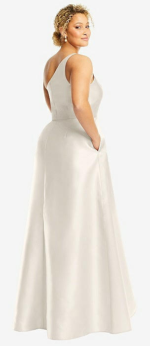 One-Shoulder Satin Gown with Draped Front Slit and Pockets in ivory