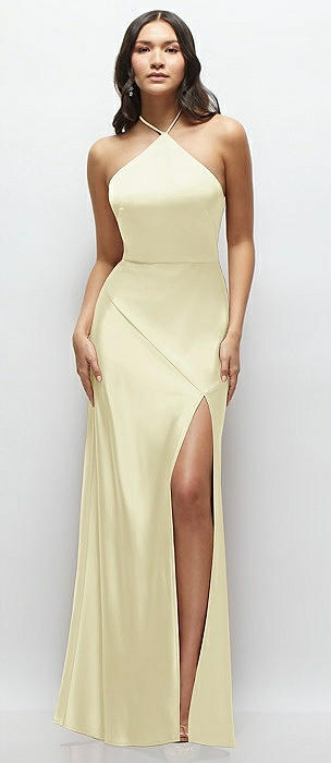 High Halter Tie-Strap Open-Back Satin Maxi Dress in butter yellow