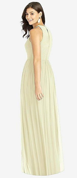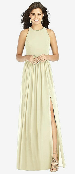 Shirred Skirt Jewel Neck Halter Dress with Front Slit in butter yellow