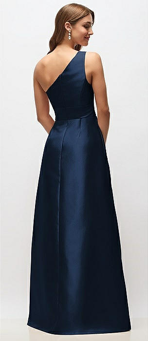 Bow One-Shoulder Full A-Line Satin Maxi Dress in midnight navy
