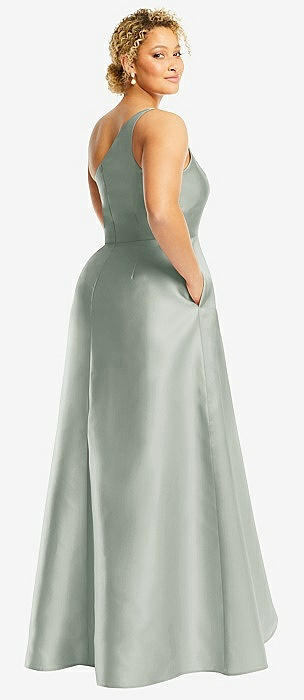 One-Shoulder Satin Gown with Draped Front Slit and Pockets in willow green