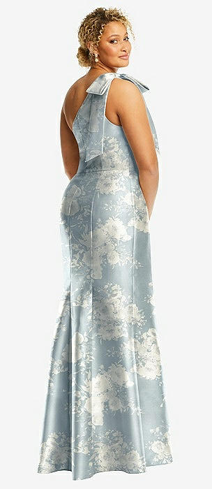 Bow One-Shoulder Floral Satin Trumpet Gown in porcelain blue seraphina floral