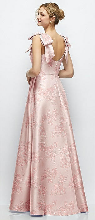 Deep V-Neck Floral Satin Ball Gown with Shoulder Bows in bow and blossom print
