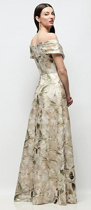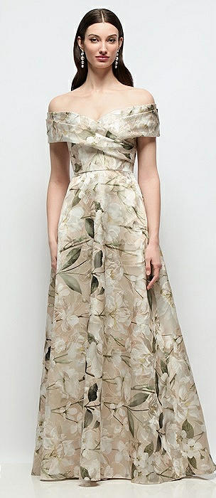 Off-Shoulder Wrap Floral Metallic Organza Jacquard Maxi Dress with Full Skirt in plumeria floral print