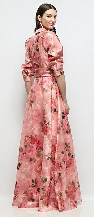 Floral Organza Jacquard Shirt Dress with Full Maxi Skirt & Sash in guava floral print