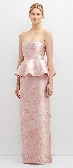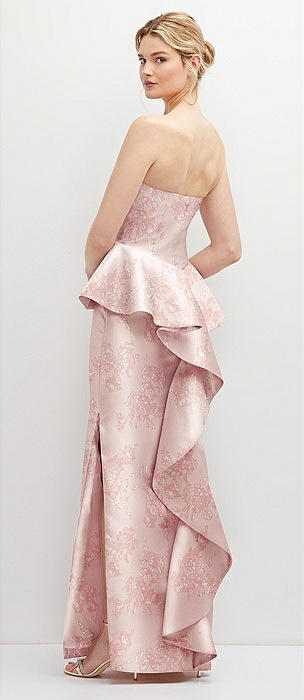 Floral Strapless Satin Maxi Dress with Cascade Ruffle Peplum Detail