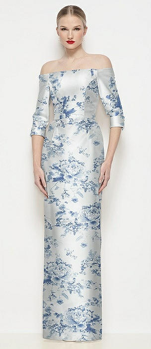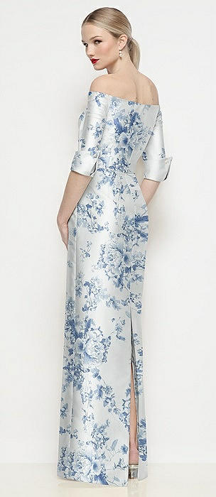 Off-the-Shoulder 3/4 Sleeve Satin Floral Maxi Dress with Column Skirt in cottage rose larkspur