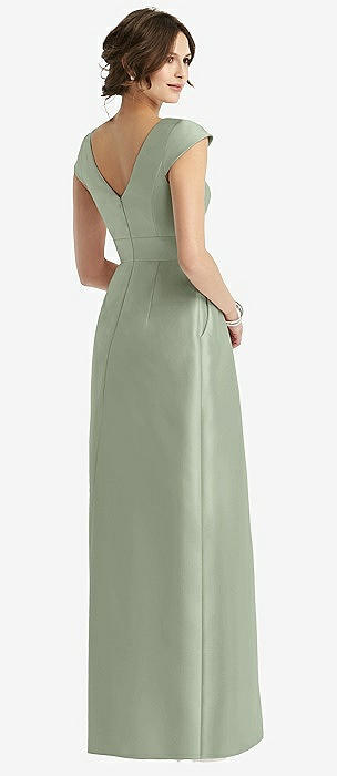 Deep V-back Satin Trumpet Dress with Cascading Bow at One Shoulder in mist