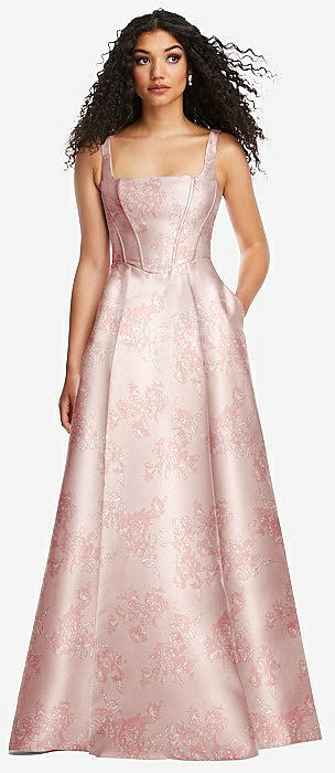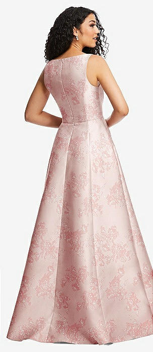 Boned Corset Closed-Back Floral Satin Gown with Full Skirt in bow and blossom print