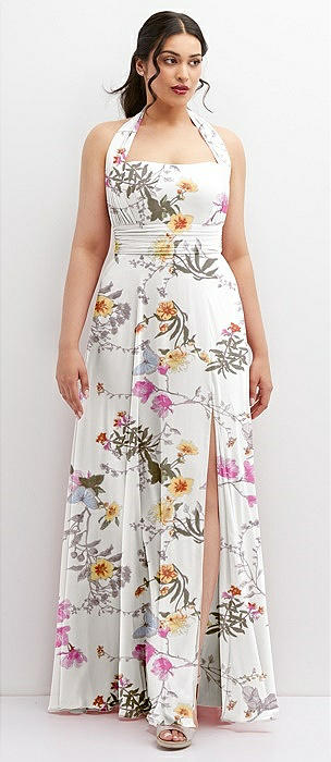 Shirred Skirt Jewel Neck Halter Dress with Front Slit in butterfly botanica ivory
