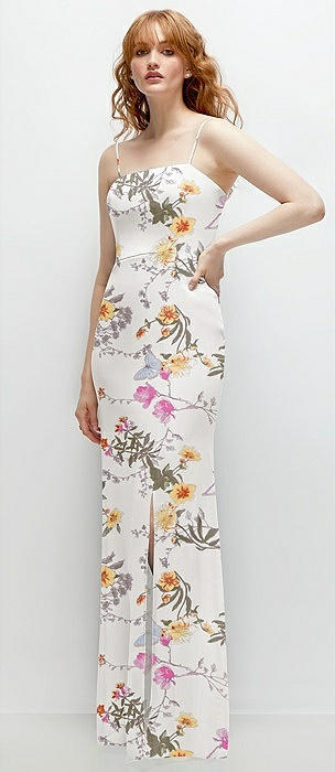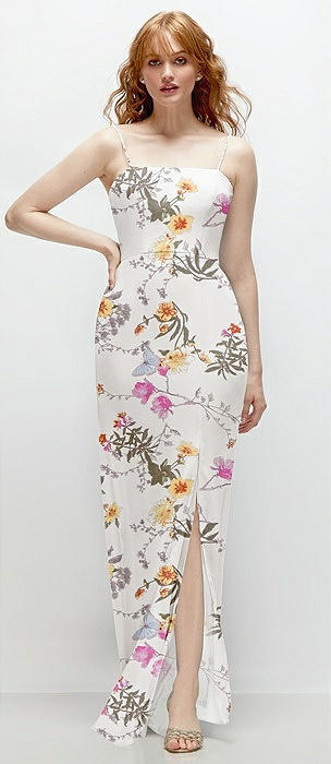 Spaghetti Strap Draped Skirt Gown with Front Slit in butterfly botanica ivory