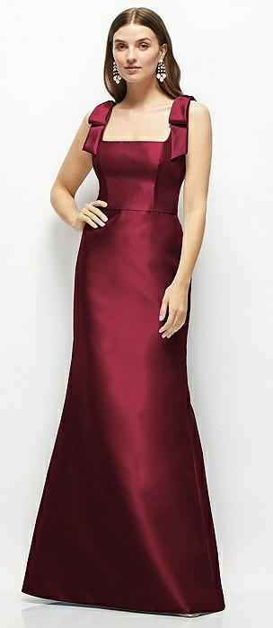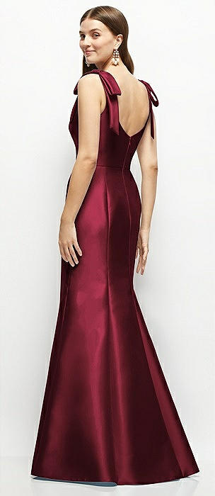 Satin Fit and Flare Maxi Dress with Shoulder Bows in cabernet