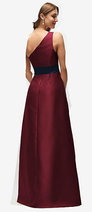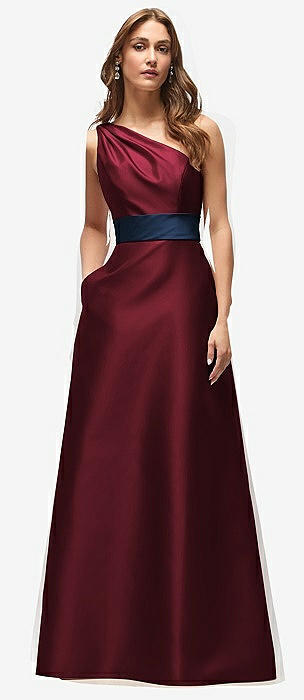 One-Shoulder Draped Skirt Satin Trumpet Gown in cabernet