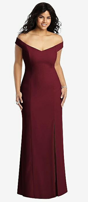 Off-the-Shoulder Criss Cross Back Trumpet Gown in cabernet