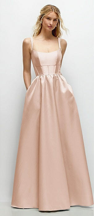 Scoop Neck Drop Basque Skirt Satin Maxi Dress with Pockets in cameo