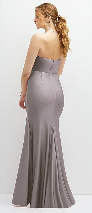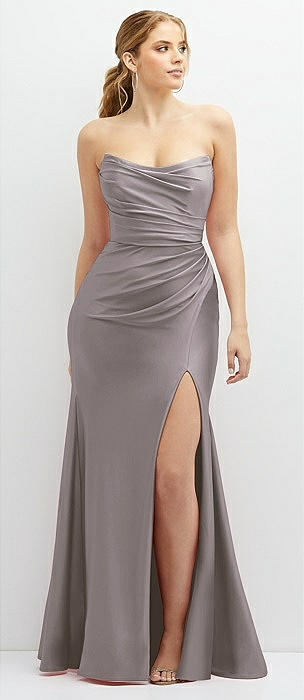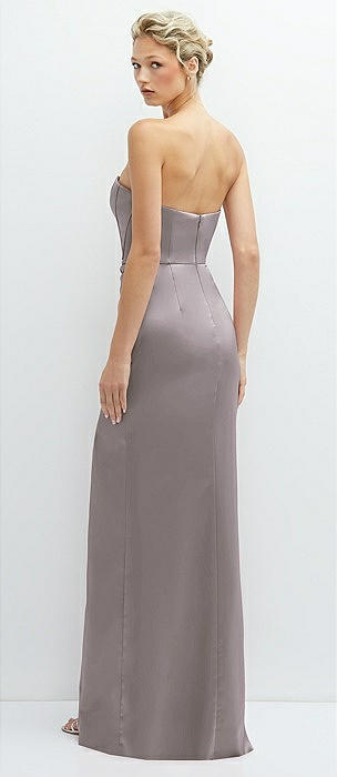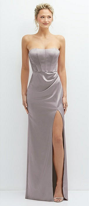 Strapless Topstitched Corset Satin Maxi Dress with Draped Column Skirt in cashmere gray