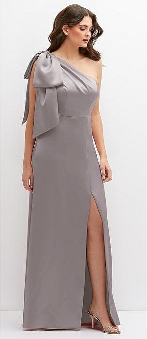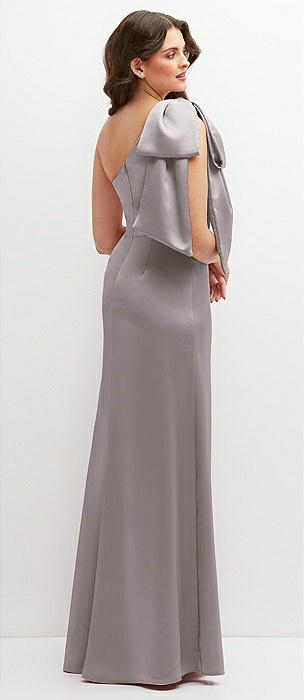 Cascading Bow One-Shoulder Stretch Satin Mermaid Dress with Slight Train in cashmere gray